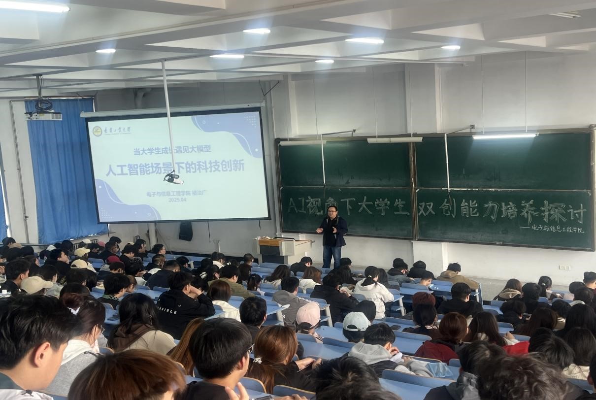 于4月9日13:30在9-502教室举办“AI视角下大学生双创能力培养探讨”主题讲座。本次讲座特邀褚治广博士担任主讲人,近300名电信学子参加此次活动。