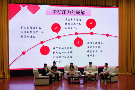 的王超四位同学作为分享嘉宾。几位同学分别从专硕与学硕的区别,如何安排考研时间,如何选择目标院校专业以及考取本校研究生的优势等几方面做了详细介绍。